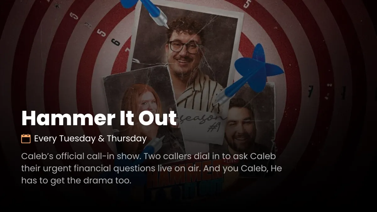 Caleb’s official call-in show. Two callers dial in to ask Caleb their urgent financial questions live on air. And you Caleb, He has to get the drama too.